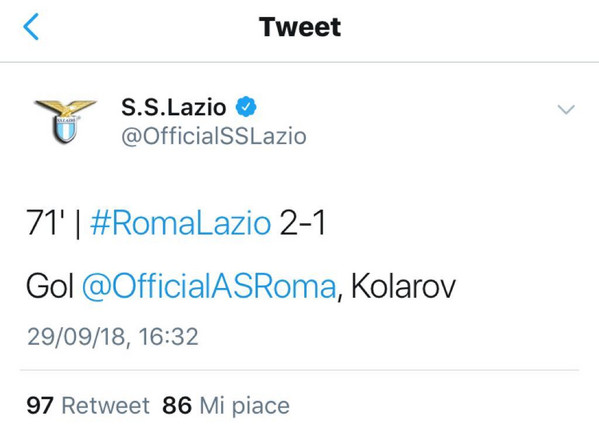 I protagonisti sono ovviamente quelli che il derby l'hanno deciso. Uno su tutti Aleksandar Kolarov. "Se segno al derby esulto", aveva detto il giorno della presentazione due estati fa. Promessa più che mantenuta. Il gol alla fine è arrivato. E per di più al minuto 71. La risposta a quel gol di Lulic che 5 anni fa decise la finale di Coppa Italia in favore dei biancocelesti. Tanto basta a far si che la stessa cronaca su Twitter del profilo ufficiale della Lazio diventi un motivo per ironizzare.
