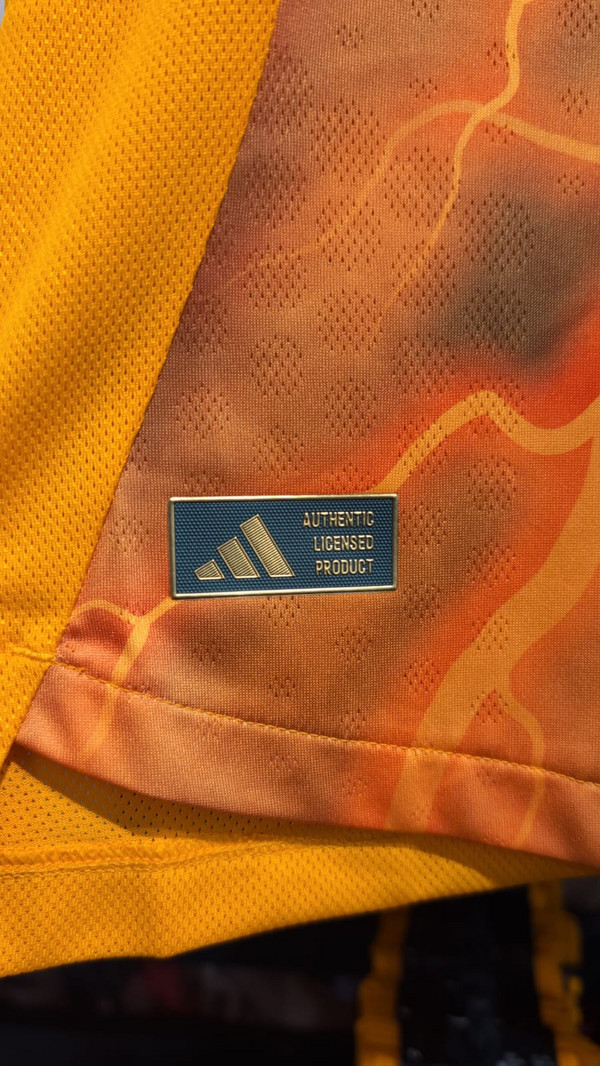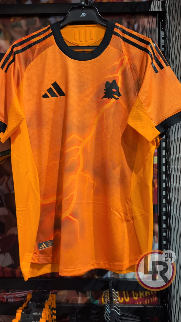 La Roma, insieme ad Adidas, ha svelato oggi il nuovo kit away per la stagione 2025/25. La divisa già da oggi è in vendita nei Roma Store e online. Il nuovo kit Away incarna la potenza e la maestosità dell’Antica Roma attingendo dal mito che avvolge la storia ultramillenaria dell’Urbe. Il pattern su fondo arancione riporta infatti un possente fulmine, simbolo associato a Marte come dio dei duelli e del tuono e padre, per la leggenda, di Romolo e Remo. Il Lupetto di Gratton sul petto, il girocollo e le caratteristiche strisce adidas in nero, rendono ancora più aggressivo e moderno il design del kit. Il nuovo Kit Away 2025/26 sarà indossato per la prima volta sabato 30 agosto in occasione del match all’Arena Garibaldi contro il Pisa.