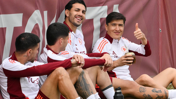 Intanto Lorenzo Pellegrini, Matias Soulé, Leandro Paredes ed Eldor Shomurodov (con un mate in mano) hanno osservato la seduta da bordocampo.